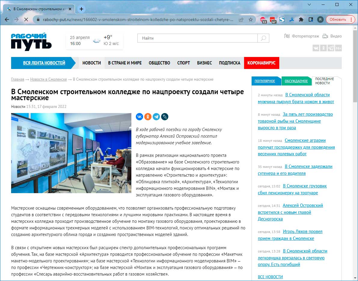 Губернатор посетил новые мастерские на базе Смоленского строительного колледжа