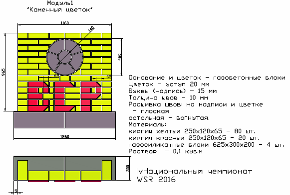 Конкурсантам по компетенции «Облицовка плиткой» требуется облицевать конструкции заданной конфигурации, согласно эскизу задания. Конкурс по компетенции «Кирпичная кладка» включает в себя кладку модулей из кирпича, блоков различной сложности, декоративную кладку, с разными видами расшивки швов. В компетенции «Сухое строительство и штукатурные работы» участники должны провести сборку конструкции с установкой тепло- и звукоизоляции, финишное шпаклевание с заделкой стыков и углов, а также выполнить задание в стиле фристайл, украсив конструкцию.